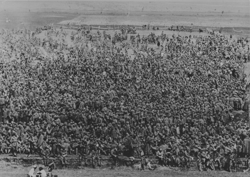По бокам колонны двигались бронетранспортеры с направленными на пленных пулеметами. Между машинами шагали солдаты с автоматами в руках. В пути пристроили еще несколько колонн. К исходу дня общая длина колонны уже достигала нескольких километров.