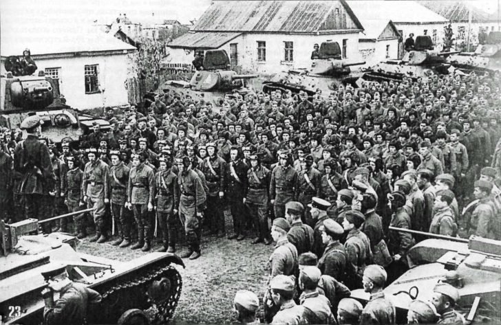 Советские танкисты , экипажи бронетехники (тяжелые танки КВ-1, средние танки Т-34 и легкие танки Т-60) из состава 121-й танковой бригады Южного фронта на митинге перед началом наступления.